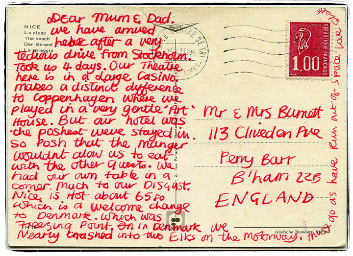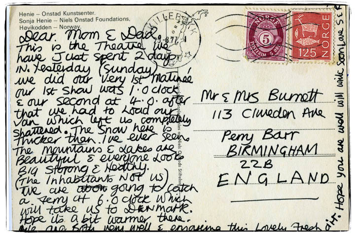 Dear Sis, I am sitting in the same cafe ordering the same dinner and writing the same postcard as 1 year and 3 months ago, it’s a time warp, its like we never did the I.C.A. The audience is so different here in Denmark. We are in this strange High School miles from anywhere doing Dream. The audience are all the kids from this school, they wonder in and out all through the show, giggle at you and offer you sweeties and tobacco, they clap soon as you suggest it and join in and then clear off in the middle of the show if they feel like it. Someone jumped on stage and tried to join in …….totally harmless but unnerving. When we arrived here yesterday they were cat calling Rod Kojac .. hey you Kojak!! we should have known ….